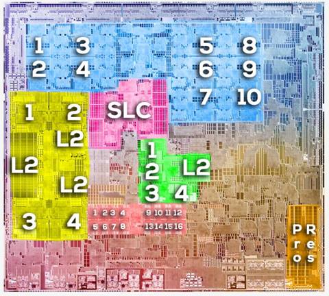 (Blue=GPU, Yellow=P-CPU, Green=E-CPU, Red=Neural Engine, Pink=System Level Cache , Orange=De-/Encode。來源:High Yield)
