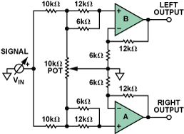 在該電路中,信號(hào)使用串聯(lián)10 kΩ電阻在兩個(gè)放大器之間分配。一個(gè)帶接地游標(biāo)的電位計(jì)插入兩個(gè)同相輸入之間。電位計(jì)和10 kΩ電阻的組合呈現(xiàn)出輕負(fù)載,大多數(shù)電源都可以輕松驅(qū)動(dòng)。放大器的增益配置為3。當(dāng)電位計(jì)游標(biāo)位于任一端時(shí),一個(gè)輸入接地,因此沒有信號(hào)直通相應(yīng)的輸出。另一個(gè)輸入看到 V在/2,因此其輸出為 1.5 × V在.游標(biāo)位于中間時(shí),兩個(gè)放大器的輸入均為V在/3,所以每個(gè)放大器的輸出為V在.因此,通過移動(dòng)游標(biāo)(機(jī)械或電子),信號(hào)電平在0至1.5 × V范圍內(nèi)連續(xù)變化在單通道,1.5 × V在在另一個(gè)通道上為 0,因此,對(duì)于聽者來說,源似乎穿過聲場(chǎng)從一個(gè)通道移動(dòng)到另一個(gè)通道。這允許將圖像或聲音的明顯來源放置在左右揚(yáng)聲器之間的任何位置。