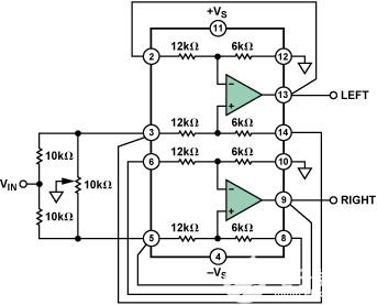 圖1所示的音頻“panpot”電路根據(jù)電位計(jì)設(shè)置,連續(xù)改變左右立體聲通道之間單聲道音頻信號(hào)的位置。低成本和低失真是音頻電路的重要考慮因素。AD82731雙通道低失真差動(dòng)放大器使用內(nèi)部增益設(shè)置電阻,以確保兩個(gè)通道之間的出色匹配。無需外部元件,每個(gè)通道配置為兩個(gè)增益為3的高性能放大器。在音頻范圍內(nèi),總諧波失真小于0.0007%。