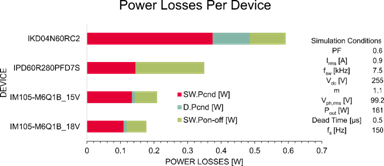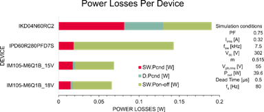 逆變器級(jí)的效率計(jì)算如表1所示。本分析考慮了一個(gè)兩電平三相逆變器,即,總共6顆器件。在標(biāo)稱負(fù)載下,IM105-M6Q1B的總效率增加量比IKD04N60RC2多2.7%,比IPD60R280PFD7S多近1%。在高負(fù)載條件下,相比于IKD04N60RC2和IPD60R280PFD7S,效率分別增加了約為1.5%和0.5%。