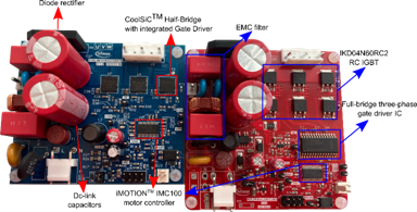 本小節(jié)討論了IM105-M6Q1B在外形(即,功率密度)方面的額外好處。此外,利用IKD04N60RC2和IM105-M6Q1B,對(duì)采用類似設(shè)計(jì)的低功率驅(qū)動(dòng)板的無(wú)散熱片輸出功率能力進(jìn)行了比較分析。圖7并排顯示了這兩個(gè)驅(qū)動(dòng)板的圖片,以便清楚地突出顯示它們的差異。兩個(gè)驅(qū)動(dòng)板都搭載了類似的電磁干擾(EMI)濾波器、二極管整流器、DC link電容器和單片機(jī)IMC101T-038(iMOTION™ IMC100系列電機(jī)控制器)。