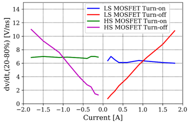 圖11:在Tc,max下,IM105-M6Q1B驅(qū)動(dòng)板在不同開(kāi)關(guān)電流下的電壓變化率(dv/dt,20-80%)