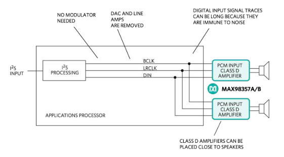 這些放大器不需要模擬輸入 D 類設計所需的 DAc 和線路驅動器。因此, 空間和 系統(tǒng)成本下降, 設計變得更簡單。許多 D 類放大器接受脈沖編碼調制 PCM( 或 I 1 s 數(shù)據(jù), 這需要三根線: BCLK 、LRCLK 和 DIN (圖 1) 。PCM 數(shù)據(jù)格式不需要 對調制器或應用處理器上的數(shù)據(jù)上采樣來提供立體聲數(shù)據(jù)。