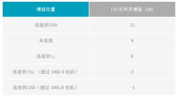 表 1. MAX98360 的 I2S/左對齊增益設置。