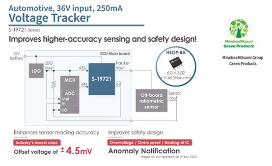 新產(chǎn)品S-19721系列具備業(yè)界最低等級(※1)失調(diào)電壓,在為ECU外部的傳感器和元器件供電時(shí),可以實(shí)現(xiàn)準(zhǔn)確的傳感器讀數(shù)。其次,由于S-19721系列可以輸出最大250mA的電流,還可用于、因傳感器的高功能化而需要大電流輸出的應(yīng)用、以及隨著傳感器安裝數(shù)量的增加,需向多個(gè)傳感器一起供電的應(yīng)用。