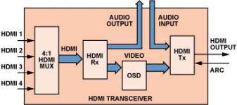 以 ADV7623 為例,這款 HDMI 收發(fā)器集成了 4:1 HDMI 輸入多路復(fù)用器 (mux )、 HDMI 接收器、 屏幕顯示 (OSD)引擎和 HDMI 發(fā)射器。就個體而言, 上述每種功能應(yīng)該都需要彼此 獨立的 IC 及五花八門的固件,但一個收發(fā)器就可以將全部功能組合到一個綜合解決方案中, 節(jié)省了板載面積、降低了固件 復(fù)雜程度、縮減了物料成本, 為家庭影院系統(tǒng)設(shè)計人員帶來了 極大方便。