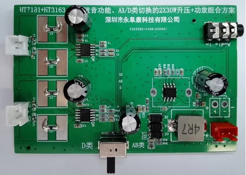 2,采用帶AB/D類切換功能的單聲道40W功放芯片HT3163(立體聲應(yīng)用采用2顆),能夠完全避免FA/AM收音干擾。兩節(jié)鋰電供電升壓到16V輸出2*30W;3節(jié)鋰電或鉛酸電池升壓18V輸出2*40W;