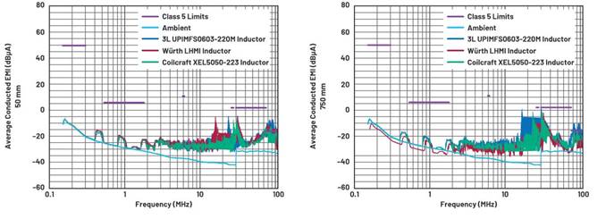 采用三個22 µH屏蔽電感進行測試,如表1所示。在不采用CM扼流圈的相同電路中評估EMI,每個電感都按照能提供最佳性能的方向安裝。比較結(jié)果如圖5所示。在本次研究中,Coilcraft XEL電感的FM頻段噪聲抑制性能最佳,與其他3L電感相比,將FM頻段EMI降低5.1 dB。