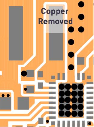 高dV⁄dt開關(guān)節(jié)點是一個噪聲源,會產(chǎn)生電容耦合,增加CE中的CM EMI噪聲。它也像天線一樣工作,向空間輻射電磁噪聲,也會影響輻射EMI。因此,盡可能減小PCB布局上的開關(guān)節(jié)點面積可以改善EMI性能。為了在PCB電路板上測試這一點,我們切除了部分銅芯,并將電感移動到更靠近IC的位置(如圖7所示),以此減小開關(guān)節(jié)點面積。我們測試了切除銅芯之前和之后的EMI,測試結(jié)果如圖8所示。