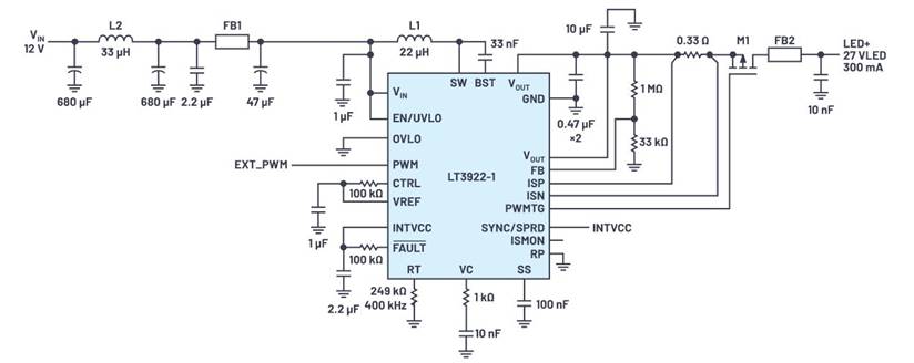 圖2.LT3922-1汽車HUD LED驅(qū)動器的簡化原理圖。