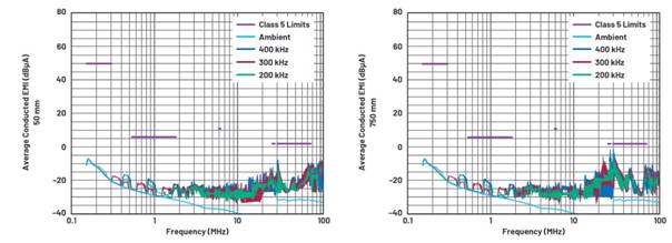 除非另有說明,本次研究中進行的所有測試均啟用SSFM功能。啟用SSFM之后,開關(guān)頻率及其諧波下的EMI尖峰都會降低。