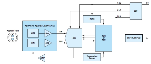 ADA4571是一款低延遲集成信號(hào)調(diào)理功能的AMR傳感器,提供單端模擬輸出。ADA4571單芯片解決方案提供良好的角度精度(典型角度誤差僅為0.10度),工作速度可高達(dá)50k rpm。ADA4571-2是雙通道版本,可提供完全冗余能力而不影響性能,適合安全關(guān)鍵型應(yīng)用。