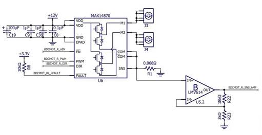 C-BISCUIT 電機控制電路有一個 0.068 Ω 檢測電阻;這意味著電機驅動電流被限制在約 1.47 A。Tri-Track 電機的數(shù)據(jù)表表明啟動電流約為 1.5 A,因此 1.47 A 是一個保守的限制,仍允許電機正常啟動。但考慮到我之前沒有使用該電機或 MAX14870 的經(jīng)驗,如果發(fā)現(xiàn) 0.068 Ω 不是 R SENSE的值,我不會感到驚訝。