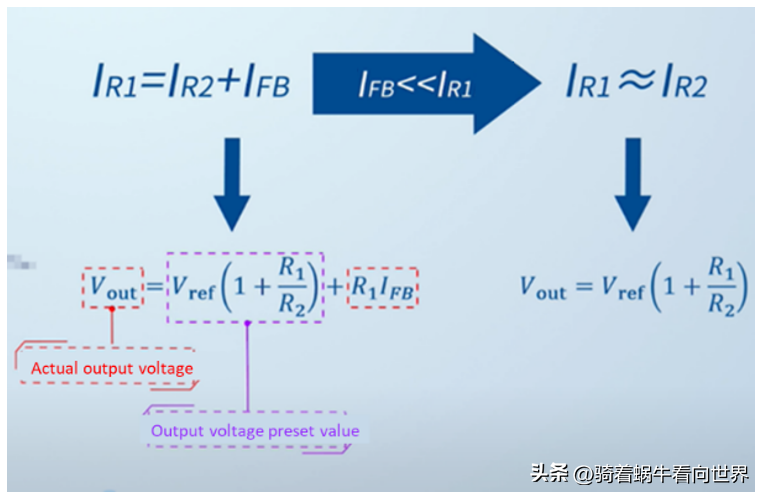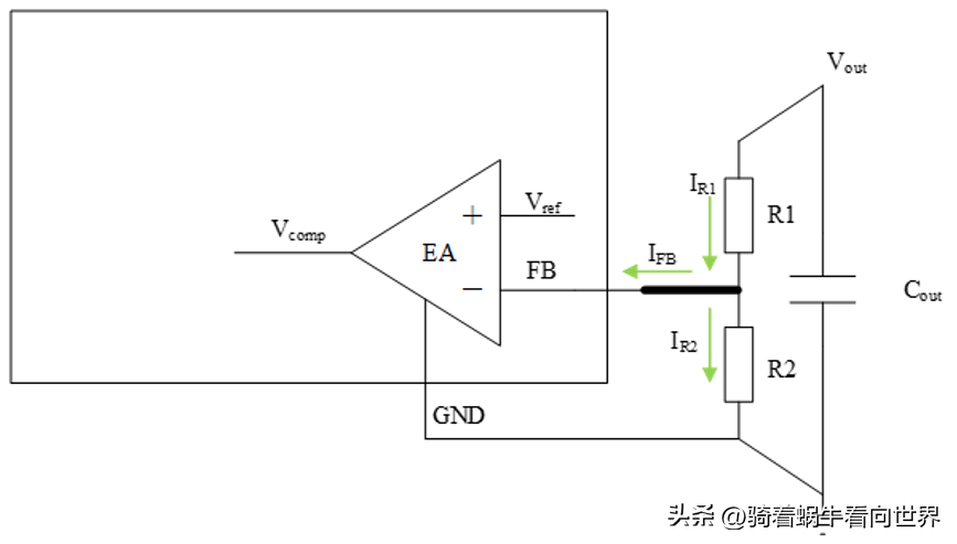 FB 是運(yùn)算放大器(op amp)的負(fù)輸入端,它會汲取一定的電流。當(dāng) FB 電流(IFB)在分壓網(wǎng)絡(luò)中占比較小時(shí),IFB 可忽略不計(jì);當(dāng)其占比較大,即分壓電阻選值較大時(shí),IFB 就不容忽視(見圖 3)。