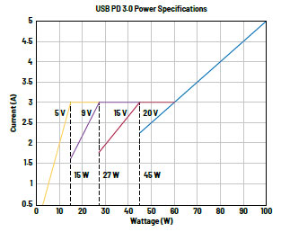 USB PD 3.0標(biāo)準(zhǔn)要求電源根據(jù)其功率容量,提供特定的供電軌。能夠提供超過15 W的電源必須提供5 V和9 V供電軌。能夠提供超過27 W的電源必須提供5 V、9 V和15 V供電軌。最后,能夠提供超過45 W的電源必須提供5 V、9 V、15 V和20 V供電軌。