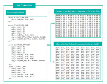定制腳本是使用簡單、易于使用的命令在GUI中編寫的。該軟件將定制腳本轉(zhuǎn)換為十六進制格式,并將其寫入IC配置區(qū)域。開發(fā)人員可以根據(jù)基于其應(yīng)用需要提供的功能來定義簡單的函數(shù)和序列。