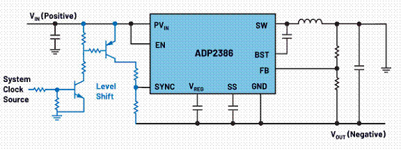 專為反相電壓設(shè)計(jì)的開(kāi)關(guān)穩(wěn)壓器IC免去了對(duì)這種外部電路的使用需求。ADI公司根據(jù)降壓穩(wěn)壓器IC設(shè)計(jì)了一系列開(kāi)關(guān)穩(wěn)壓器IC,旨在為系統(tǒng)(即整個(gè)電子電路)和反相開(kāi)關(guān)穩(wěn)壓器IC之間的通信提供便利。電路不需要使用如圖2所示的外部電平轉(zhuǎn)換結(jié)構(gòu)。