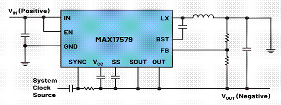 圖3.MAX17579設(shè)計(jì)為反相降壓-升壓穩(wěn)壓器,其中已集成電平轉(zhuǎn)換功能