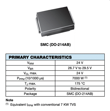 在每一個(gè)電池組、每一個(gè)電池簇與外部的連接電路中,都會(huì)有二極管的存在,通過其單向?qū)ǖ哪芰泶_保通信接口不受到損壞;同時(shí)在多種電路拓?fù)渲校捕夹枰䴓O管的參與。在此我們?yōu)榇蠹彝扑]一款來自Vishay的二極管器件,非常適用于儲(chǔ)能系統(tǒng)BMS的應(yīng)用。該器件名為XMC7K24CA XClampR™ TVS二極管,在貿(mào)澤電子的具體料號(hào)為“XMC7K24CA-M3/H”。