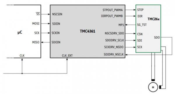 圖:TMC4361A 以 SPI 模式或者 S/D 模式連接 TMC2130 或 TMC2160 步進(jìn)驅(qū)動(dòng)芯片