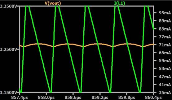 解決這個(gè)問(wèn)題后,我們來(lái)考慮一下 V OUT。我們的預(yù)期輸出電壓為 3.3 V,模擬電路的 V OUT為 3.26 V。占空比計(jì)算中所需的效率項(xiàng)是一個(gè)較小誤差的該項(xiàng)通過(guò)開(kāi)關(guān)的占空比直接影響電路行為- 控制波形,并且 90% 的假設(shè)值并不在所有情況下都是準(zhǔn)確的。