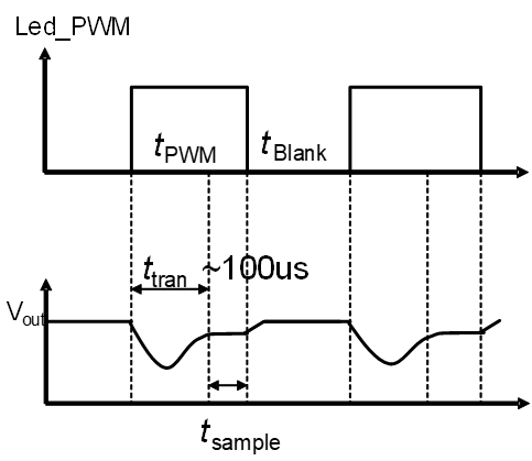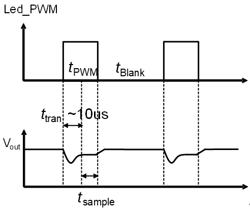 圖 7 展示了智能手表 LED 的逐周期負(fù)載情況。PWM 負(fù)載包含兩個階段:瞬態(tài)時間 (ttran) 和采樣時間 (tsample)。ttran 測量升壓轉(zhuǎn)換器在發(fā)生負(fù)載電流或電源電壓突變后快速穩(wěn)定至目標(biāo)輸出電壓的時間。tsample 是光電二極管穩(wěn)定后的恒定值。