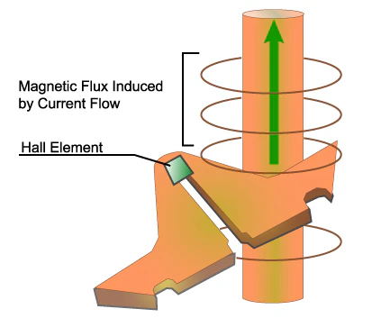 U 型環(huán)和霍爾元件。流經(jīng) U 形回路的電流在與其路徑正交的平面中產(chǎn)生磁力線。垂直于霍爾元件平面的磁通可以產(chǎn)生霍爾電壓。
