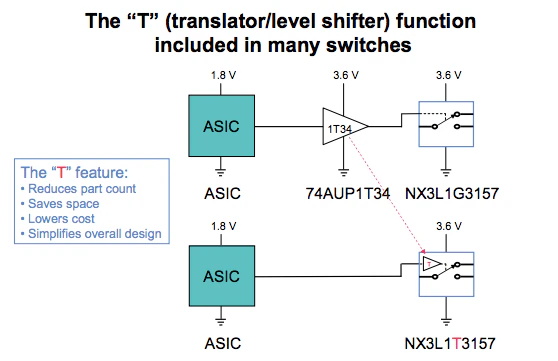 在某些應(yīng)用中,模擬開關(guān)位于低壓 ASIC 和較高電源電壓組件之間的接口處。為了正確激活開關(guān),通常在選擇引腳上使用電壓轉(zhuǎn)換器(或電平轉(zhuǎn)換器)以確保滿足激活閾值。恩智浦模擬開關(guān)提供集成了轉(zhuǎn)換器功能的完整器件系列,從而節(jié)省部件數(shù)量、PCB 空間并降低總體系統(tǒng)成本。