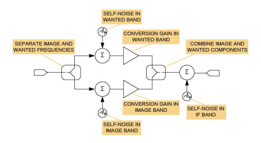 當(dāng)混頻器是信號鏈的一部分時(shí),噪聲系數(shù)分析的主要困難就會出現(xiàn)。所有實(shí)際混頻器都會圍繞本地振蕩器 (LO) 頻率折疊 RF 頻譜,根據(jù) fOUT = |fRF – fLO| 創(chuàng)建包含兩側(cè)頻譜總和的輸出。在外差架構(gòu)中,這些貢獻(xiàn)之一通常被認(rèn)為是虛假的,而另一個(gè)則被認(rèn)為是有意的。因此,圖像拒絕過濾或圖像消除方案可能被用來很大程度上消除這些響應(yīng)之一。在直接轉(zhuǎn)換接收器中,情況有所不同;兩個(gè)邊帶(高于和低于 fRF = fLO)均被轉(zhuǎn)換并用于所需信號。因此,這確實(shí)是混頻器的雙邊帶 (DSB) 應(yīng)用。