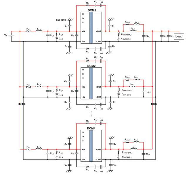 在陣列模式下使用 DCM2322 模塊時(shí),需要在設(shè)計(jì)上進(jìn)行權(quán)衡:用一個(gè)去耦網(wǎng)絡(luò)來(lái)實(shí)現(xiàn)并聯(lián)運(yùn)行。實(shí)際上,這意味著每個(gè) DCM2322 只需在輸出被饋入公共總線(xiàn)之前安裝一個(gè)輸出電容器。即使所有模塊共用一個(gè)輸入電壓源,每個(gè) DCM2322 也需要一個(gè)單獨(dú)的輸入濾波器。濾波器用于限制每個(gè)模塊反射的紋波電流,并協(xié)助抑制拍頻電流的產(chǎn)生,當(dāng)允許多個(gè)動(dòng)力輸入級(jí)直接相互作用時(shí),可能會(huì)產(chǎn)生拍頻電流(圖 4)。