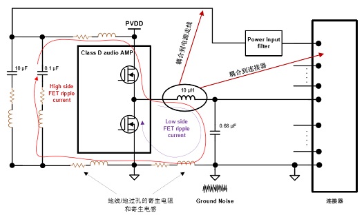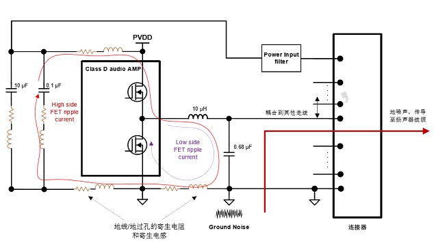 地噪聲來源分析:由于開關(guān)紋波電 流流過寄生電感/電阻,造成參考地(Reference Ground)和功放地之間的電壓偏差。地噪聲會(huì)通過音頻功放傳導(dǎo)至喇叭線(或者其他 走線)影響傳導(dǎo)/輻射測(cè)試結(jié)果。