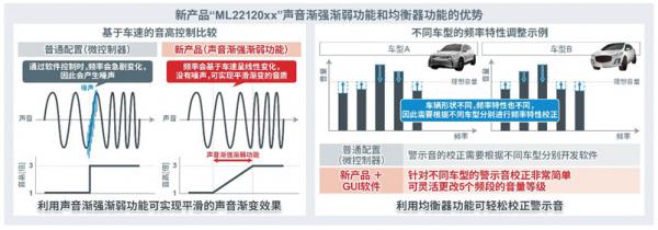 “ML22120xx”由具備警示音生成功能、聲音漸強(qiáng)漸弱功能和均衡器功能的專用硬件構(gòu)成。另外,通過(guò)使用專用的GUI軟件,可以輕松滿足相關(guān)法律法規(guī)對(duì)AVAS所需的音量和頻率特性等的規(guī)定*2。