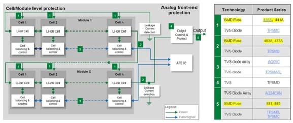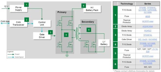 Littelfuse作為全球保護器件的領(lǐng)導(dǎo)品牌,汽車硬件回路的過壓過流保護產(chǎn)品自然也少不了,保險絲做為過流保護器之一,在電池管理系統(tǒng)、車載充電機、配電單元、直流變換器等應(yīng)用最為廣泛,其中電池管理系統(tǒng)采用貼片保險絲,其余使用引線或鎖螺栓保險絲。另外控制板與信號端口等為了提高重復(fù)使用率可以采用PTC熱敏電阻作為過流保護,又叫自恢復(fù)保險絲。