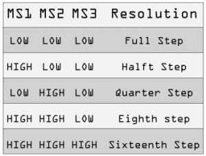 MS1, MS2 和 MS3針腳用于微步設(shè)置,如上圖所示。ENABLE針腳用于打開和關(guān)閉場效應(yīng)管的輸出,低電平打開,高電平關(guān)閉。
