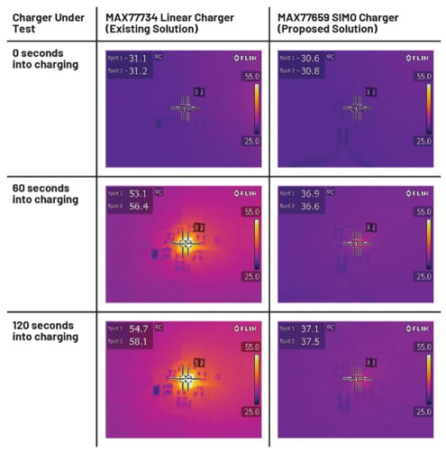 在2分鐘的測試過程中,線性解決方案的溫度升至58.1°C,而SIMO PMIC僅升至37.5°C;谶@些結(jié)果可知,與線性充電解決方案相比,SIMO解決方案能夠?qū)厣档图s72%。