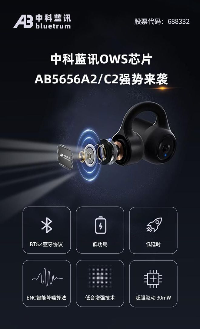 | 中科藍(lán)訊推出新款應(yīng)用于無線藍(lán)牙耳機(jī)的藍(lán)牙音頻芯片AB5656A2/C2,支持藍(lán)牙5.4連接協(xié)議,適用于OWS耳機(jī)。