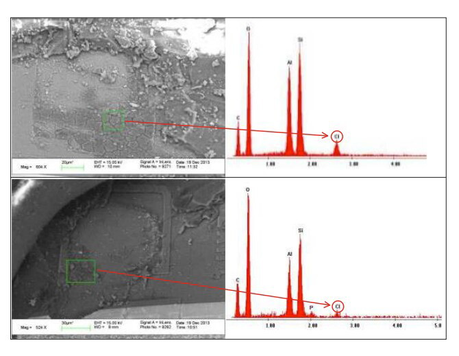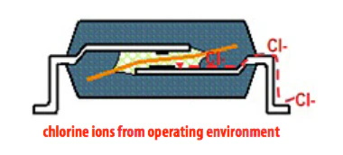 鹵化物是離子性的并且?guī)в须姾桑焕纾珻l‐、Br‐ 和 F‐。氯是電負(fù)性強(qiáng)的離子,該物質(zhì)通過 Vcc(電源)電勢引起的電場漂移遷移到封裝中。Vcc(電源)焊盤通常是個受到氯相關(guān)問題“攻擊”的焊盤。一般來說,GND(地)焊盤一般不會被腐蝕,因為該焊盤一般處于地電位或電位。Vcc(電源)焊盤通常是個受到氯相關(guān)問題“攻擊”的焊盤。一般來說,GND(地)焊盤一般不會被腐蝕,因為該焊盤一般處于地電位或電位。這表明不需要對鉛模具界面進(jìn)行分層以使離子污染物進(jìn)入。僅僅存在離子物質(zhì),在存在水分和電位差等加速因素的情況下,足以啟動離子污染過程。圖 1 顯示了環(huán)境中的氯離子如何進(jìn)入封裝并腐蝕焊盤的機(jī)制。圖 2 顯示在引線框架與模制化合物(未分層)之間的界面處發(fā)現(xiàn)了氯,圖圖3顯示了由于使用鹵化物助焊劑而導(dǎo)致的焊盤腐蝕。