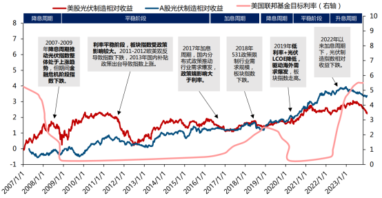 復(fù)盤歷史,2019年,光伏板塊指數(shù)靠著光伏平價(jià)帶來(lái)行業(yè)市場(chǎng)化拐點(diǎn)和降息帶來(lái)的融資成本下降刺激海外需求上升兩大因素持續(xù)走高。然而,歷史總是驚人的相似。如今產(chǎn)能過(guò)剩促使光伏組件價(jià)格加速下跌,甚至跌破部分成本價(jià),帶動(dòng)光伏LCOE再次降低;美聯(lián)儲(chǔ)也會(huì)在2024年開始新一輪降息周期。兩因素的疊加會(huì)大大增加光伏電站的收益率,促使光伏電站加速建設(shè)。