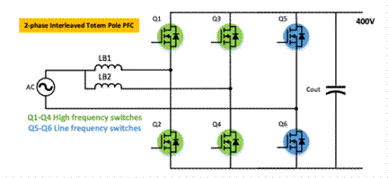在中高功率的功率因子校正應(yīng)用(通常為6.6kW及以上)中,無(wú)橋圖騰柱拓?fù)渥兊迷絹?lái)越普及。如圖2所示,在這種拓?fù)渲,慢橋?Q5-Q6)以電網(wǎng)頻率(50-60Hz)開關(guān),而快橋臂(Q1-Q4)則會(huì)進(jìn)行電流整形和升壓,并在硬開關(guān)模式下以更高頻率(通常為65-110kHz)運(yùn)行。盡管無(wú)橋圖騰柱拓?fù)浯蠓岣吡诵什p少了功率元件的數(shù)量,但它提高了控制方面的復(fù)雜性。