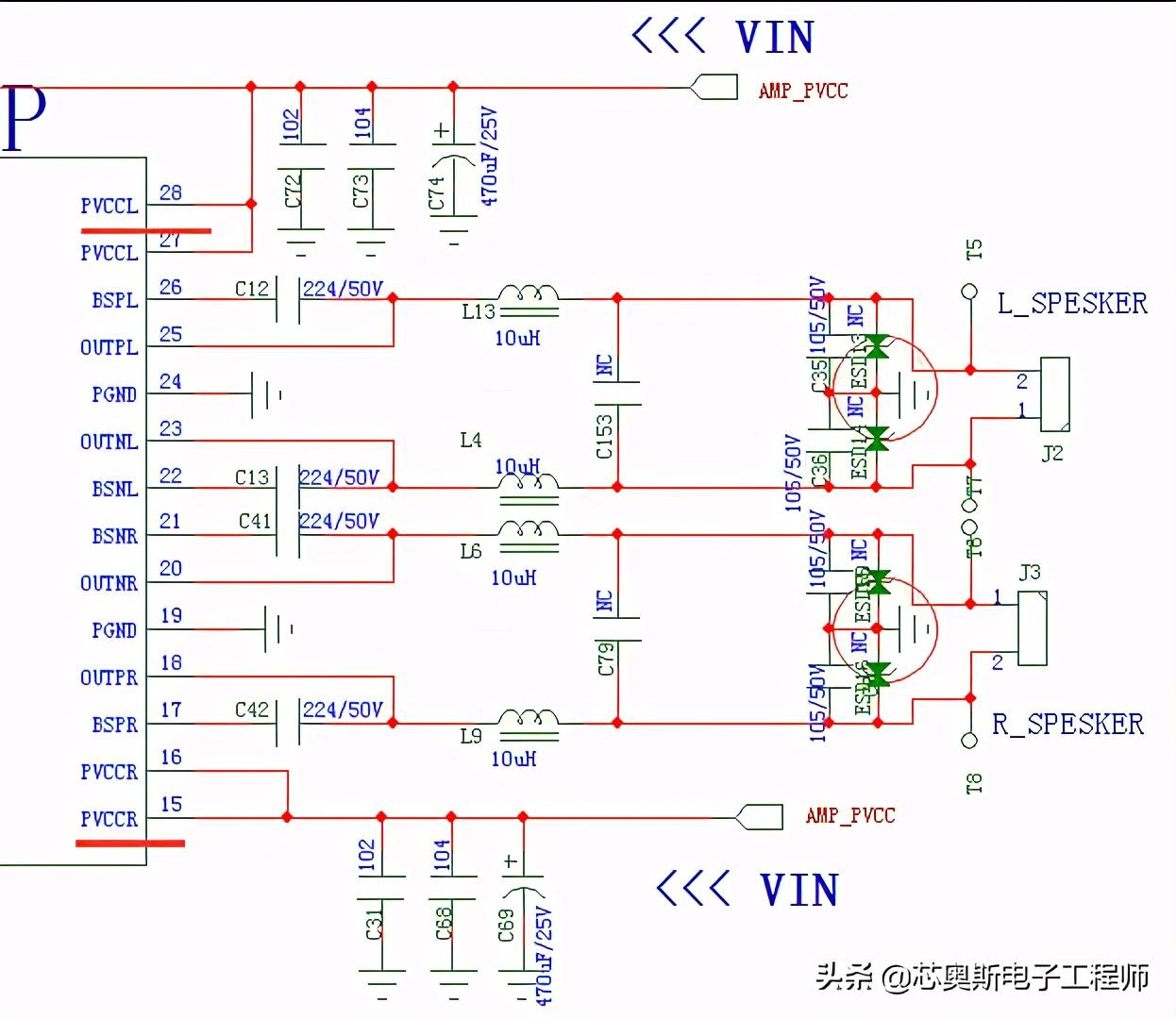 功放供電腳分PVCCL和PVCCR,不難看出是兩組獨立的供電,所以這兩個腳上放的電容一定要一樣,一定要平衡,這里可能就是很多小伙伴在做立體聲音響的時候,測試功率發(fā)現(xiàn)兩個聲道功率有相差的原因了。