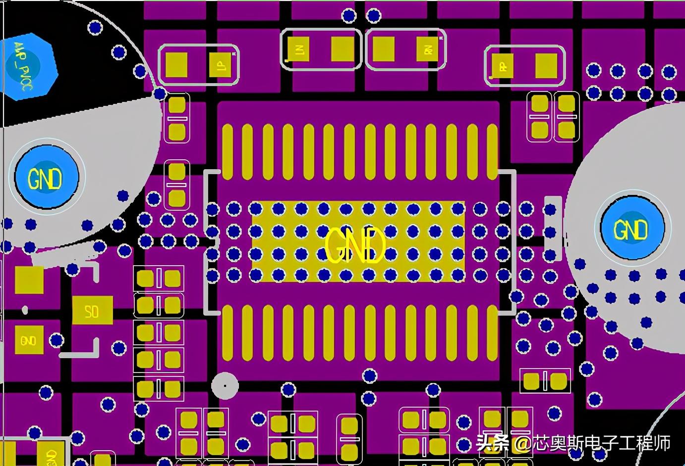 還有就是電容在布局的時候,我們盡可能的保持一個原則,小電容靠近芯片管腳,也可以理解為電源過來先經(jīng)過大電容后再經(jīng)過小電容,且電容一定要求靠近功放供電腳放置。
