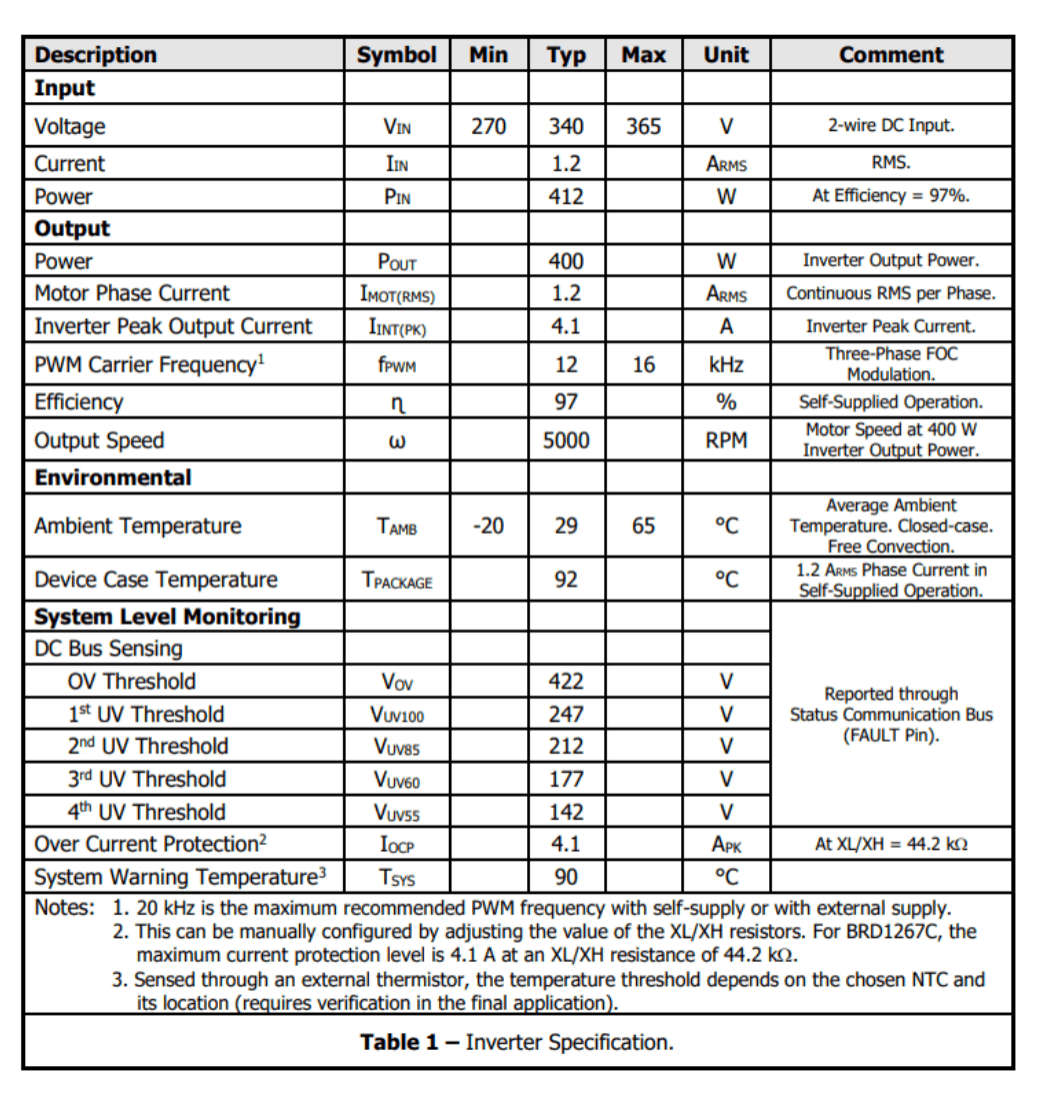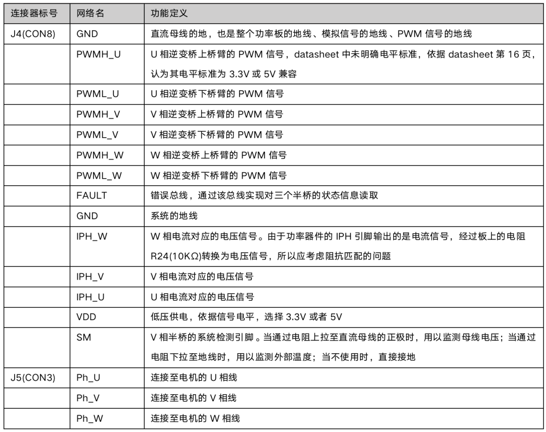 此外,該評估板的關(guān)鍵電信號主要包括:半橋功率器件,相電流與電流信號的對應(yīng)關(guān)系為400uA/A,電流信號轉(zhuǎn)電壓信號所使用的電阻值為10KΩ,對應(yīng)電壓信號為4V/A,該半橋最大輸出電流為0.7A,對應(yīng)最大輸出電壓為2.8V;半橋的上橋臂使用的PWM信號為低邏輯,即當(dāng)該P(yáng)WM信號為低時(shí),對應(yīng)上的上橋臂導(dǎo)通;器件ID,逆變橋使用三個半橋功率器件,該三個半橋使用同一根FAULT_BUS信號與微控制器通信,因此需要設(shè)置每個半橋的通信識別ID,通過將半橋功率器件的ID引腳分別:連接至BPL引腳、懸空、連接SG引腳共三種方式來設(shè)置三個ID,微控制器具有默認(rèn)的ID,因此無需設(shè)置。