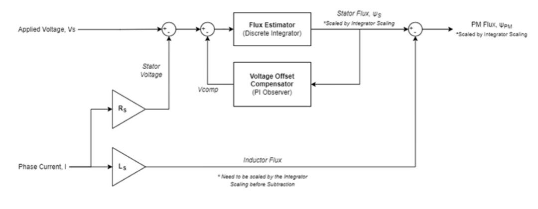 磁鏈觀測器原理如下圖所示。Vs即控制器的輸出電壓,減去電機(jī)電流×電機(jī)電阻,理想情況下,為電機(jī)的反電動勢+電機(jī)電感的電壓,通過該電壓計(jì)算得到總的磁鏈,并減去由電流+電感產(chǎn)生的磁鏈,即可得到電機(jī)轉(zhuǎn)子的磁鏈。由此可以看出,當(dāng)電機(jī)轉(zhuǎn)速過小,將導(dǎo)致反電動勢過小,信噪比過小,影響觀測效果。同時(shí)可以看出,電機(jī)電感、電阻、永磁體磁鏈等參數(shù)也將影響觀測器的結(jié)果的準(zhǔn)確性。