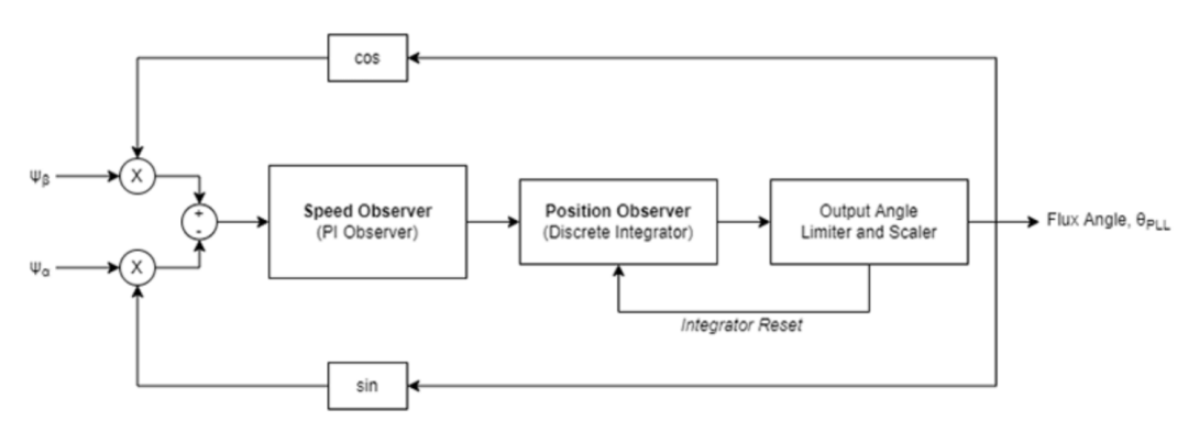 理論上,當(dāng)?shù)玫睫D(zhuǎn)子的磁鏈?zhǔn)噶繒r(shí),即可通過arctan()函數(shù)計(jì)算出電機(jī)轉(zhuǎn)子位置,但是實(shí)際中此方法計(jì)算得到的電機(jī)角度紋波毛刺過大,后需一個低通濾波器。此電機(jī)控制庫使用正交鎖相環(huán)QPLL對磁鏈?zhǔn)噶窟M(jìn)行處理,即可得到低毛刺的轉(zhuǎn)子位置信號。