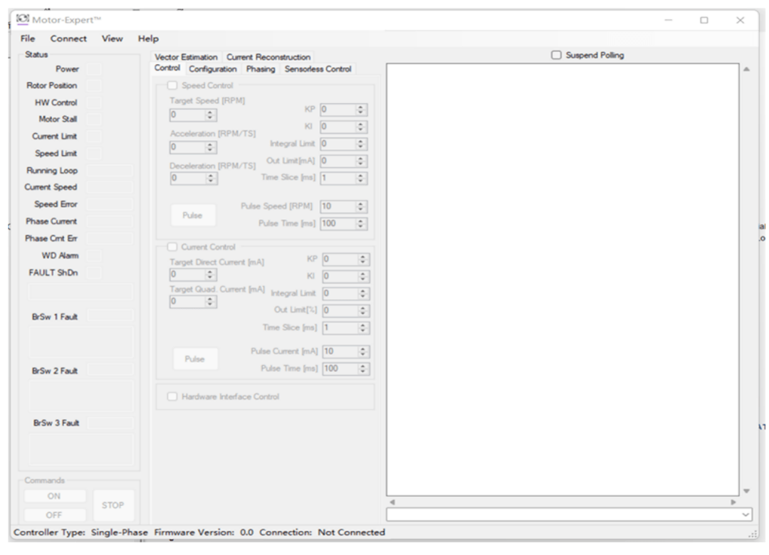 Motor-Expert 2.0是PI推出的一款嵌入C語言應(yīng)用程序、庫及控制GUI的軟件,使用BridgeSwitch™無刷直流(BLDC)電機(jī)驅(qū)動器IC的設(shè)計(jì)人員,借助該軟件可對三相電機(jī)的運(yùn)行性能進(jìn)行精確的控制和調(diào)整。其與電機(jī)控制庫的通信協(xié)議是公開的,用戶在產(chǎn)品開發(fā)過程中可使用該上位機(jī)進(jìn)行調(diào)試。根據(jù)說明文檔整理及軟件界面顯示,該上位機(jī)具備如下功能:電機(jī)狀態(tài)顯示、電機(jī)參數(shù)設(shè)置、電機(jī)控制指令設(shè)置、數(shù)據(jù)波形顯示(同一時(shí)刻最多四個信號)、控制臺等。
