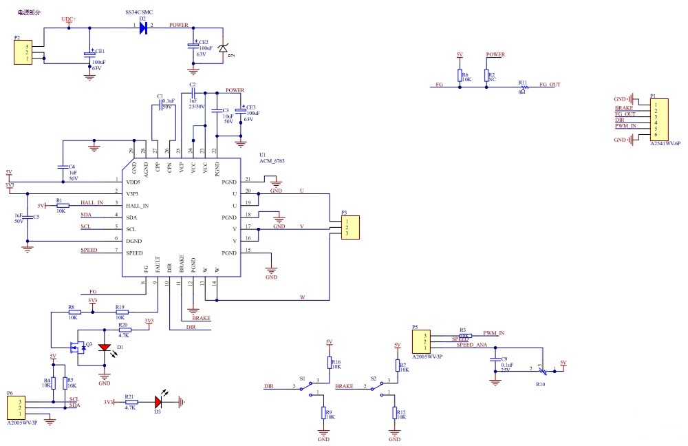 1)控制方式1, 直接的I2C寄存器控制。 利用系統(tǒng)上的MCU 對ACM6763進(jìn)行初始化( 配置電機(jī)的參數(shù), 如相電阻, Ke ,換相提前角,啟動加速度,閉環(huán)加速度,初始速度等 )或者其他控制( 調(diào)速,正反轉(zhuǎn),剎車等 )。 2)控制方式2, 硬件pin控制。SPEED pin支持外部的電壓,PWM占空比,PWM頻率等調(diào)速方式;DIR pin控制電機(jī)的正反轉(zhuǎn);BRAKE pin支持剎車。