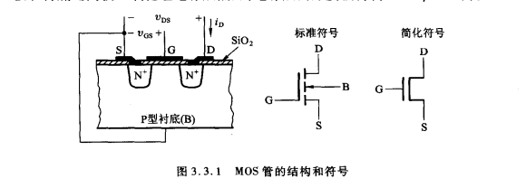圖3.3.1 中的 MOS 管屬于 N 溝道增強(qiáng)型。這種類型的MOS管采用P型襯底,導(dǎo)電溝道是 N 型。在vC5=0時沒有導(dǎo)電溝道,開啟電壓Vcs(u)為正。工作時使用正電源,同時應(yīng)將襯底接源極或者接到系統(tǒng)的電位上。在圖3.3.1給出的符號中,用D S間斷開的線段表示Vcs=0時沒有導(dǎo)電。