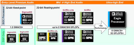 眾所周知,ADI在音頻的DSP上相當(dāng)有競爭力,從其Sigma到Sharc 類的DSP均用到了各類的音頻電子產(chǎn)品中。如下圖(圖10)所示為ADI SigmaDSP產(chǎn)品選型對比表: