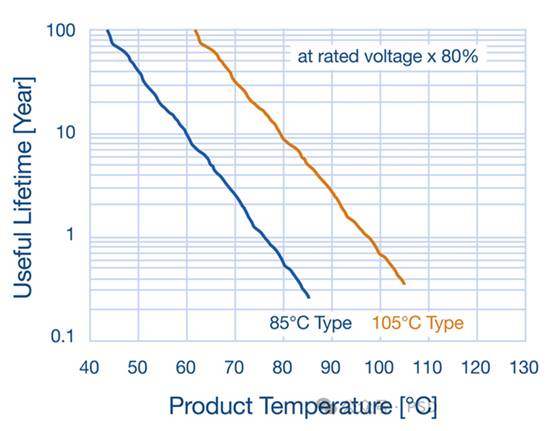 高溫會對元器件的可靠性產(chǎn)生巨大影響。圖2所示為額定溫度+85°C和+105°C的多層陶瓷電容器(MLCC)的預(yù)計壽命可靠性。從中可見,當(dāng)工作溫度為50°C時,額定溫度+85°C的MLCC使用壽命為40年;如果平均工作溫度升高10°C至60°C,那么它的使用壽命就會縮短至10年。