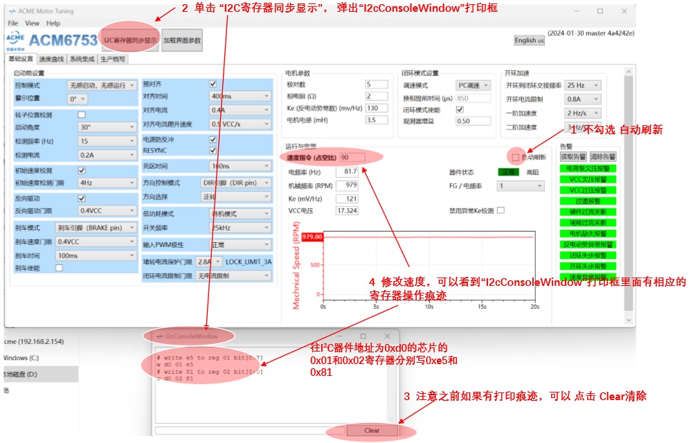 ACM6753上電默認(rèn)是外部SPEED管腳模擬電壓調(diào)速模式,當(dāng)SPEED管腳(pin 5)外部電壓不為零時(shí),上電后 ACM6753檢測(cè)到該管腳電壓為非零值就會(huì)認(rèn)為收到調(diào)速指令,但是此時(shí)電機(jī)參數(shù)還沒有通過I2C指令配置進(jìn)來,必 然會(huì)產(chǎn)生失步錯(cuò)誤,從而停留在這個(gè)錯(cuò)誤報(bào)警狀態(tài)長(zhǎng)達(dá)5秒鐘, 造成較長(zhǎng)的啟動(dòng)延時(shí). 因此在使用I2C控制ACM6753 時(shí)要么“避免在初始化之前SPEED管腳為非零值(>0.2V)”, 要么“在ACM6753上電后 300ms以內(nèi)迅速用I2C指令將 速度配置為0,然后開始初始化電機(jī)相關(guān)參數(shù)” .